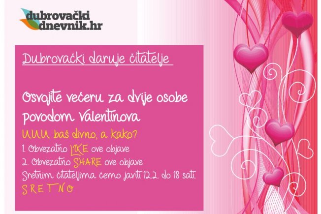 Za one koji ne sudjeluju na društvenoj mreži Facebook, pošaljite nam mail na redakcija@dubrovackidnevnik.hr s naznakom 'I ja hoću Valentinovo' zajedno s imenom i prezimenom.