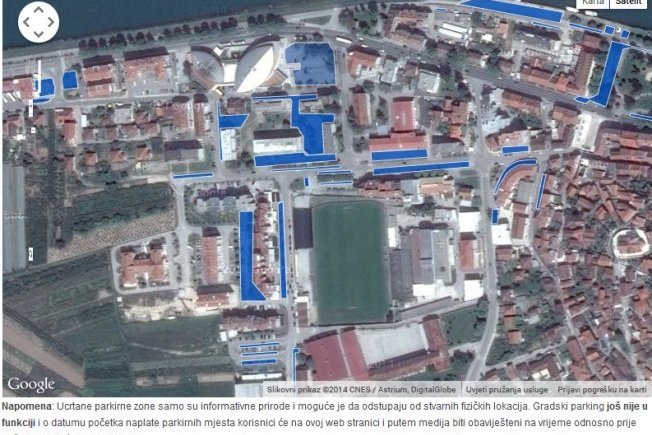 Osim parkirališta uz ulaz u Ljetno kazalište, na Autobusnom kolodvoru i u Hebrangovoj, koja će spadati u drugu (žutu) zonu, sva ostala bit će u prvoj (plavoj) zoni naplate. Cijena sata u prvoj zoni bit će 5 kn, a u drugoj zoni 3 kn.