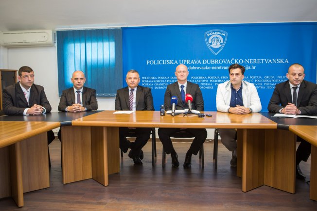 Predstavnici PU dubrovačko – neretvanske Tonći Radibratović, Hrvoje Neosidl i Đuro Đurković u pratnji svojih kolega Dražena Ruskovića i Berislava Lankaša iz PNUSKOK-a te Olega Čavke iz Odjela za organizirani kriminal Tužiteljstva BiH, predstavili su rezultate jučerašnje akcije kojom je zadan udarac dubrovačkoj narko sceni.