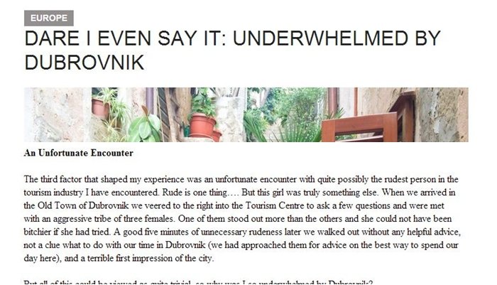 Jedna turistkinja i travel blogerica nije imala lijepe riječi o našem gradu. Njen sud je došao nakon samo jednog dana provedenog u Dubrovniku ovog proljeća kamo je doputovala iz Bosne i Hercegovine, a za takav stav 'zaslužne' su, kaže, tri 'kučke'.