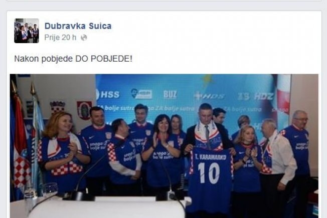 EU zastupnica Dubravka Šuica, pred jučerašnju utakmicu Brazila i Hrvatske na svom je Facebook profilu napisala: Nakon pobjede DO POBJEDE! Šuica je vjerojatno aludirala na pobjedu HDZ na predstojećim predsjedničkim izborima koja se trebala nastaviti na uspjeh Vatrenih.