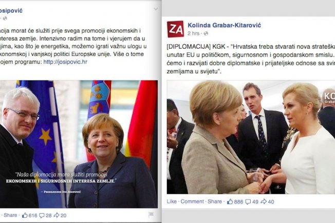 Jučer je tako predsjednik Ivo Josipović objavio status u kojem je najavio kako će raditi na tome da diplomacija bude u službi promocije ekonomskih i sigurnosnih interesa zemlje. Ovaj je post ilustriran fotografijom Iva Josipovića i kancelarke Angele Merkel.