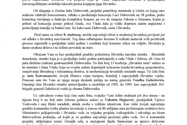 Obraćam Vam se kao predsjednik gradske podružnice Hrvatske narodne stranke – liberalnih demokrata, stranke koja je u posljednje četiri godine participirala u radu Vlade i Sabora, ali i tri puta direktno izabrani gradonačelnik Dubrovnika. Na listi broj 13 koalicije „Hrvatska raste“ nalaze se tri ministra i člana Vlade, koja su svojim radom doprinijeli uzlaznom trendu hrvatskog gospodarstva, osnaživanju liberalnog i tolerantnog društva, te modernizaciji hrvatskih oružanih snaga. Na čelu liste je Ante Kotromanović, čovjek blistave vojne karijere, branitelj i zapovjednik Hrvatske vojske. Ponosan sam što Vam uz njega mogu skrenuti pažnju na našeg generala Veselka Gabričevića. Današnji član Hrvatske stranke umirovljenika u razdoblju od 1992. do 1993. kao zapovjednik 163. brigade general Gabričević vodio je obranu Dubrovnika.