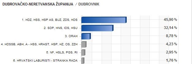 U Gradu Dubrovniku postotak glasova 'desnoj' koaliciji nešto je niži – 45,90 posto, dok je viši i postotak koji je ostvarila 'lijeva' koalicija – 32,14 posto.