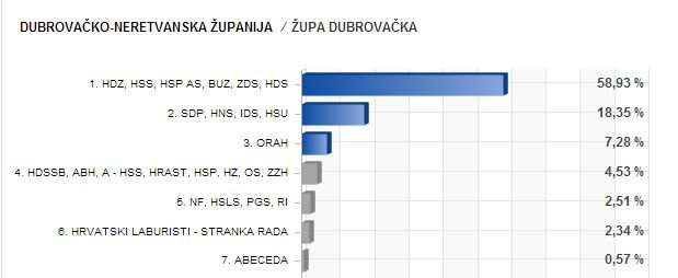 Rekorder u privrženosti desnoj opciji je Dubrovačko primorje. Glasači su čak sa 73,02 posto glasova osigurali prolaz koalciji (HDZ-HSS-HSPAS-BUZ-ZDS-HDS). Koalicija predvođena SDP-om dobila je tek 13,29 posto glasova.