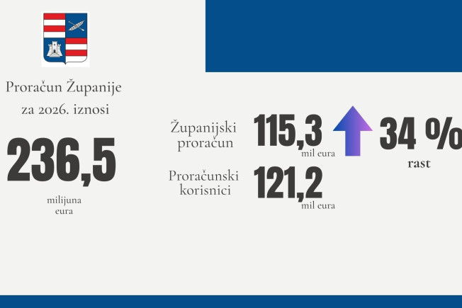 Županijski dio Proračuna planiran je u iznosu od 115,3 milijuna eura, što čini povećanje za 34% u odnosu na prošlogodišnji, dok je za proračunske korisnike planiran iznos od 121,2 milijuna eura, odnosno 1% više nego lani.